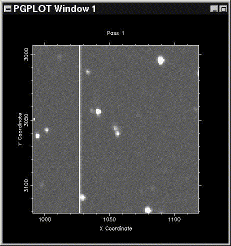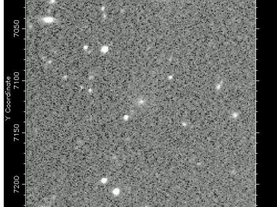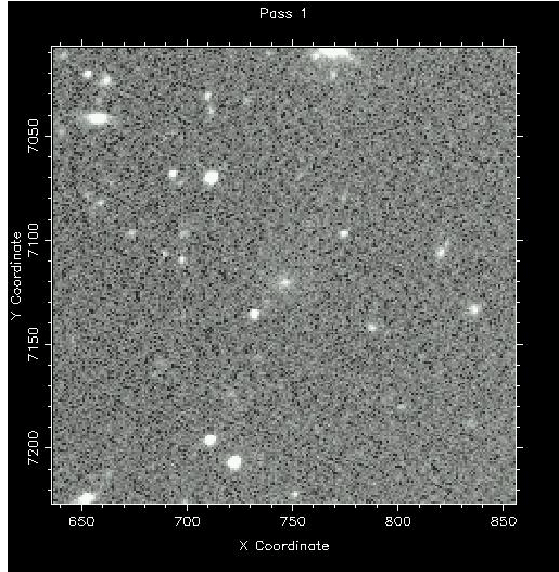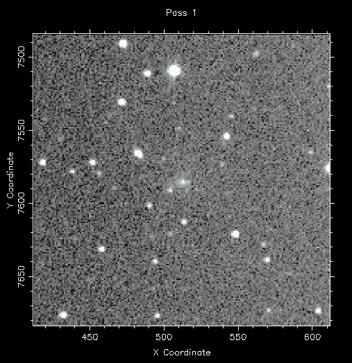 C/1997 V1 (Larsen) - This image is a result of co-adding the 9 images taken on the discovery night, giving a total integration time of about 22 minutes. Compare this image to the one above; this image shows much fainter details in both the coma and the tail. The multiple star images in a row are an artifact of co-adding the images after accounting for the comet's motion. This image is 7 arcminutes square with North at top and West to the right (1997 November 3, 05:27 - 09:02 UT). Observer credit: Jeff Larsen.