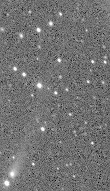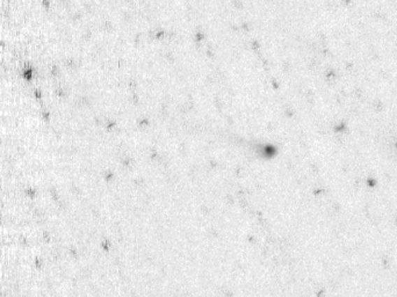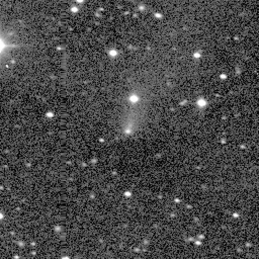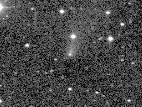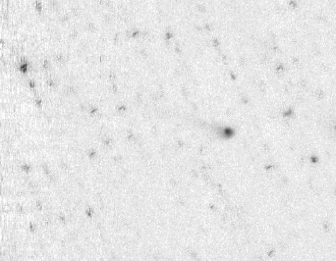C/1996 A1 (Jedicke) - This is the 3rd image of a new 17th magnitude comet discovered on the night of 1996 January 14 by Robert and Vicky Jedicke with the SPACEWATCH® Telescope. In the first image, the nucleus of the comet was very close to the star that is just below and left of the comet. North is to the right, and East at top in this image. The coma is about 20 arcseconds in diameter and the tail extends to at least 5 arcminutes (1996 January 14, 07:36 UT). Observer credit: Rob Jedicke.
