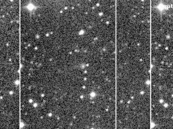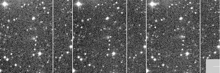 C/1998 M6 (Montani) - This comet was discovered by Joe Montani at SPACEWATCH® on 1998 June 30. This is a series of images showing the motion of the comet over a period of 16 minutes. These observations were made the next night when the comet was near the top of a chain of five stars. The coma diameter is 6-8 arcseconds. A very faint tail is seen with difficulty in the images to the left (South). East in these images is at the bottom. No additional image processing was performed on the images and they appear directly as they then came from the telescope (1998 July 1). Observer credit: Joe Montani.