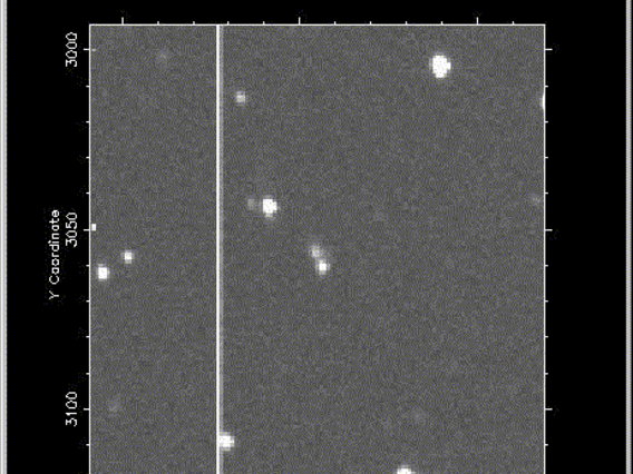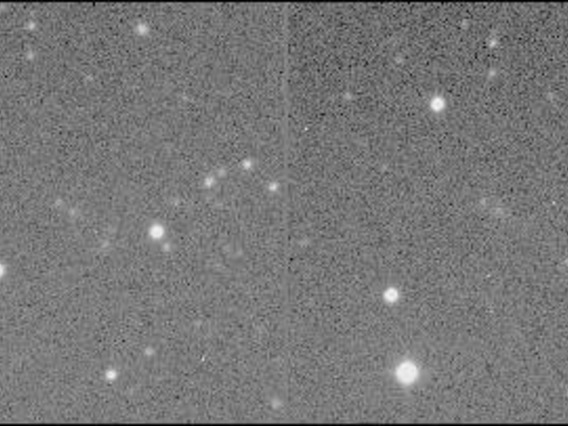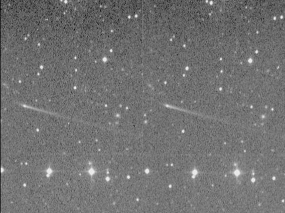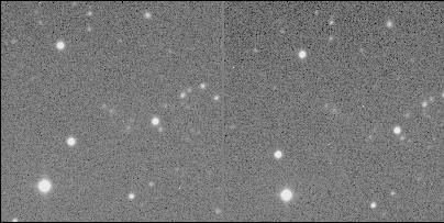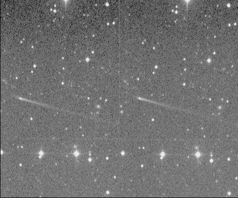 P/1996 N2 (Elst-Pizarro) - This comet orbits entirely within the Main-Belt between Mars and Jupiter, quite unlike all almost all other short-period comets. Interestingly, it has a very narrow and straight tail and a short spike in the opposite direction.; This picture is a stereo pair obtained by Jim Scotti with the 0.9-m SPACEWATCH® telescope. The field of view is 4.22' by 7.02' with North at top and West at right. In order to have the comet appear to float above the background stars in this stereoscopic view (Assuming you don't use the "cross-eyed" method of viewing 3D images), the earlier image is actually on the right.;(1996 September 21)