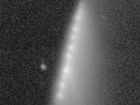 D/1993 F2 (Shoemaker-Levy 9) - A year later. This image, obtained with the SPACEWATCH® Telescope, shows the nuclear train, now spread considerably and the dust wings nearly invisible. This is one month before impact in July 1994. (1994 June 16)