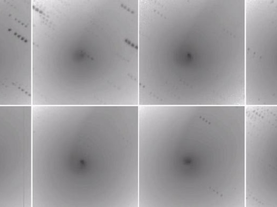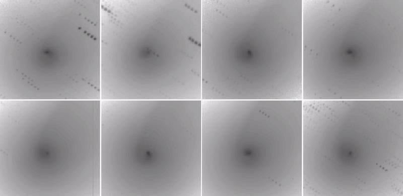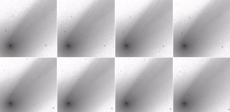 109P/Swift-Tuttle - This is a mosaic of images from 8 consecutive nights, showing the night-to-night changes in the inner coma of the comet. Notice that every 4th image, 3 days apart bear striking similarity, demonstrating the rotational period of the nucleus which is just under 3 days! (1992 November 25 - December 2). Observer credit: Jim Scotti.