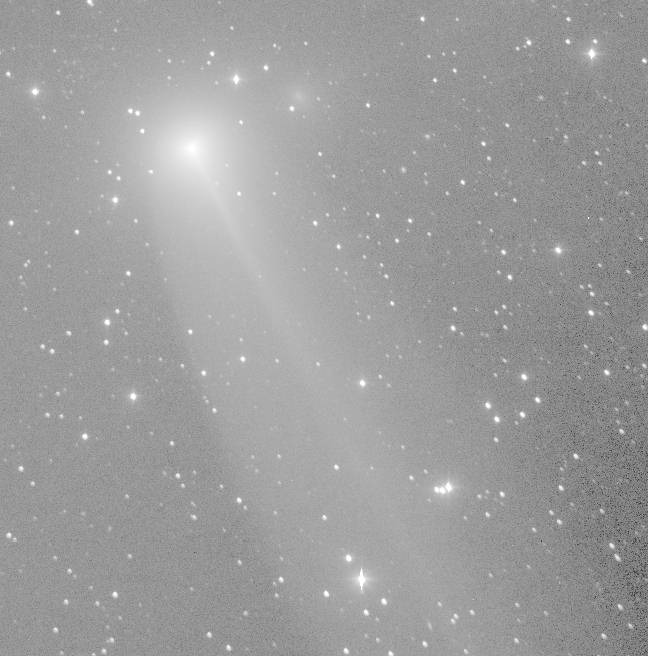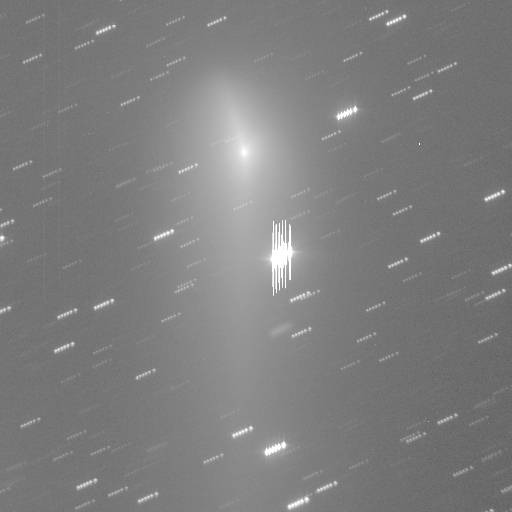 Comet 48P/Johnson was observed on 2013 February 6 while showing some unusual structure seen in this negative image obtained by Jim Scotti with the SPACEWATCH® 1.8-m telescope. This image is the sum of 27 - 60 second exposures co-added to show the comets morphology. You can see the relatively sharp nuclear condensation embedded in an elongated almost uniform surface brightness coma and a very faint tail structure to its lower right. This image has north at bottom and east at left. The coma was found to be about 15 arcseconds by 32 arcseconds and the tail extends in two parts to about 1.7 arcminutes towards p.a. 256 degrees and 1.4 arcminutes in p.a. 240 degrees.