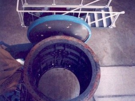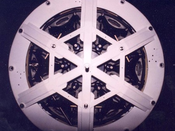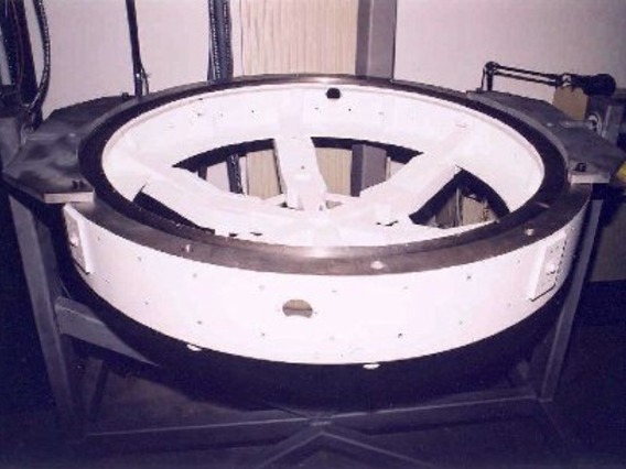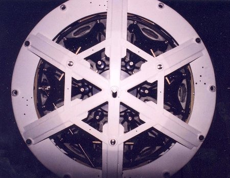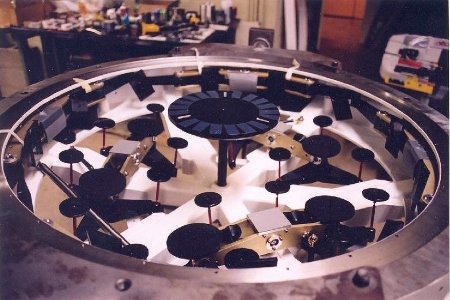 The mirror cell is shown here completed and assembled. The axial and radial support pads and flexure struts preserve the accuracy of the mirror figure while the mirror undergoes varying gravitational loading as the telescope points to different angles in the sky. The central lifting pad is seen fully extended: this lifts the mirror from the cell when cleaning or recoating is needed. (Photograph by Robert McMillan)