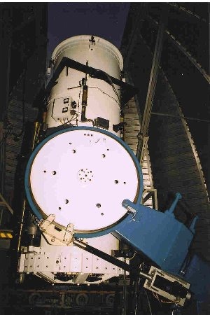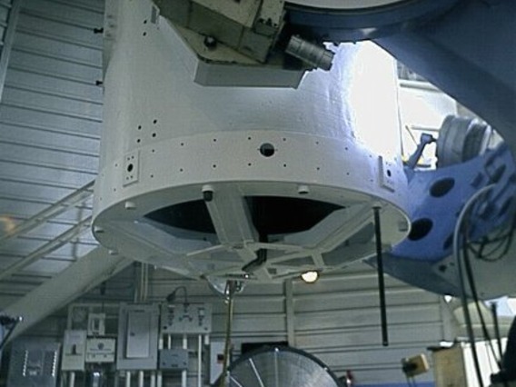 The new mirror cell is seen attached to the end of the telescope, on Kitt Peak. One can see here the great amount of free-air ventilation that the Mosaic mirror will enjoy; this will preserve image quality and help the Mosaic telescope to make faint detections. (Photograph by Terry Bressi)
