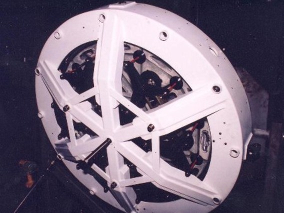 A study in symmetry: the lightweight Mosaic mirror seen from its back suface, fully installed in the mirror cell and supported by the axial and radial flotation system that the cell provides. (Photograph by Robert McMillan)