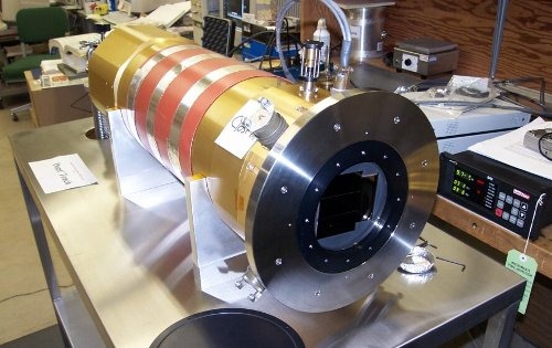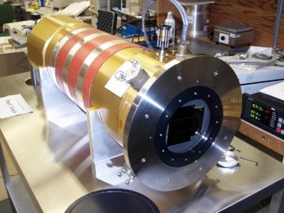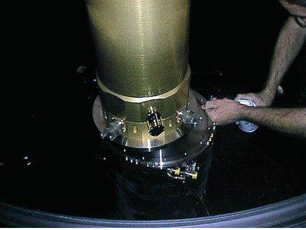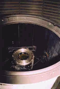 2002 October 21 - The front top end of the SPACEWATCH® 0.9-meter telescope, showing the newly installed cryostat with the mosaic of CCDs. Four wires run from the gold-colored cylindrical cryostat to counter balancing weights that tension the wires and prevent the cryostat from sagging as the telescope points lower in the sky. The large black box at the lower right houses the electronics that control and read the four CCDs. The square black frame around the telescope tube braces the spider inside the tube that holds the corrector lenses and the base of the cryostat. (Photograph by Robert McMillan)