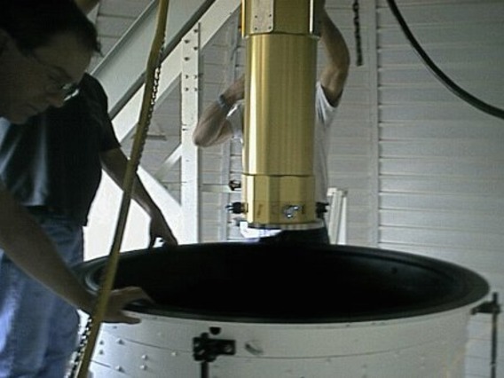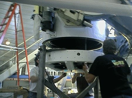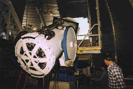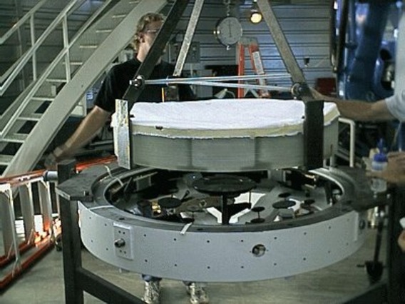 2002 October 9: Installation of the new primary mirror and its cell onto SPACEWATCH® 0.9-meter telescope. (Photograph by Terry Bressi)