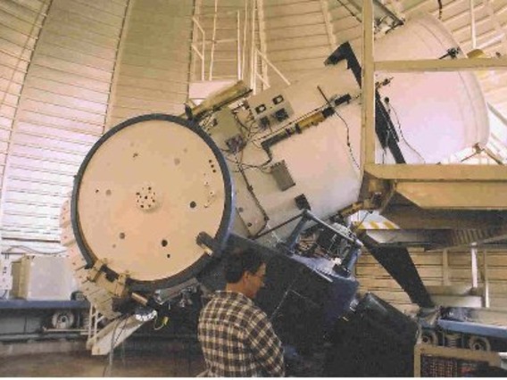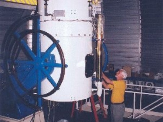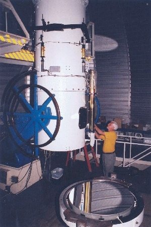 2002 October 21 - SPACEWATCH® 0.9-meter telescope in new optical configuration undergoing engineering trials. Chief Engineer M. L. Perry in the foreground (Photograph by Robert McMillan)