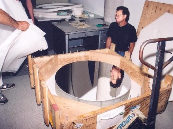 The Mosaic mirror arrived at our Lab from the coater on Sept. 24, 2002. This image depicts the mirror still in its wood air-freight crate; our form-fitting foam packing has been removed from around the edge of the mirror. The very highly reflecting overcoated Silver coating reflects more than 99.5% of incident light across our working bandpass, and the reflectivity peaks at 99.7-99.8% at 700 nm, the center of our bandpass. The lightweighted mirror weighs only 225 pounds (about 100 kg), or 35% the weight of a solid glass mirror of this size. Clear aperture is 36.75 inches (93.35 cm). Mike Williams, LPL Senior Staff Engineer, is seen near the mirror, and reflected in it. (Photograph by Robert McMillan)