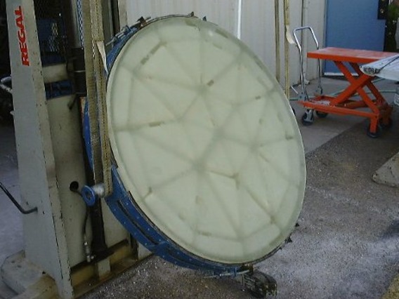 The mirror is seen here installed and safely restrained in the cell. The cell is tilted to a large angle from the vertical (nearly so much that the mirror axis is pointed almost horizontally). The mobile handling fixture enables tests and motions of this kind, as well as easy and secure installation and de-mounting of the mirror and cell on the telescope. (Photograph by Robert McMillan)