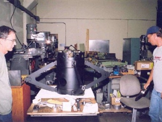 The instrument spider assembly. This holds and precisely positions the optical corrector as well as the camera cryostat containing the mosaic of 4 CCD imaging detectors. At left is SPACEWATCH® Chief Engineer, Marcus Perry, and at right is Instrument Maker, Bill Verts, of LPL. The large central cylinder has been covered with black "flock" cloth since the time of this photograph. (Photograph by Robert McMillan)