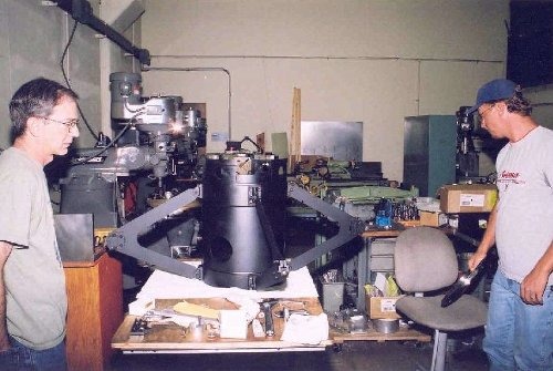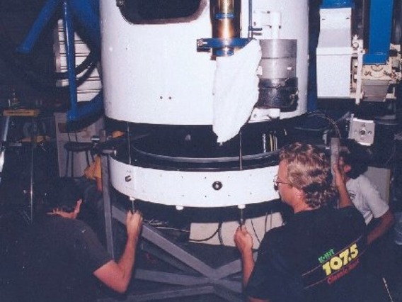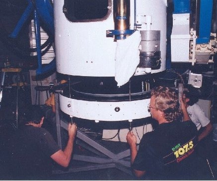 2002 October 21 - SPACEWATCH® 0.9-meter telescope in new optical configuration undergoing engineering trials. Chief Engineer M. L. Perry and Staff Engineer T. H. Bressi in the background. (Photograph by Robert McMillan)