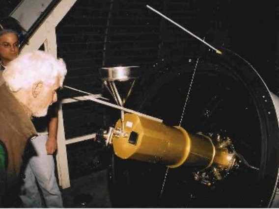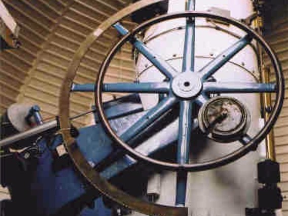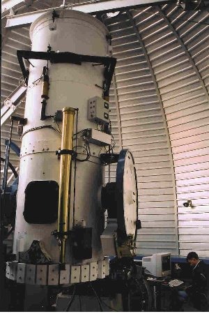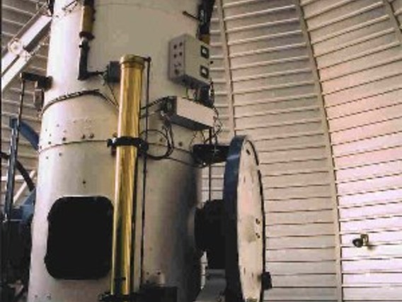 2002 October 21 - One of the best views of the recently restored antique brass refractor finder scope built by Alvan Clark and Sons (http://www.lpl.arizona.edu/~jmontani/clark.html) in 1888. Engineer T. H. Bressi works at the telescope drive console. (Photograph by Robert McMillan)
