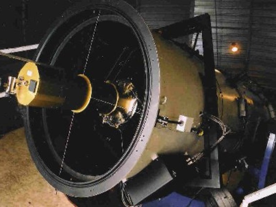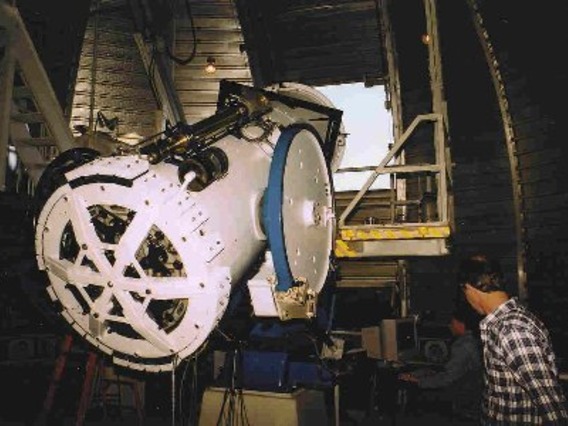 The SPACEWATCH® 0.9-meter telescope reconfigured with new optics as of 2002 October 21. Note the shorter tube and the framework near the top to which the new central support spider is attached. The first detection of an asteroid (PHA 2002 TD66) was made with the mosaic of CCDs on October 23. (Photograph by Robert McMillan)