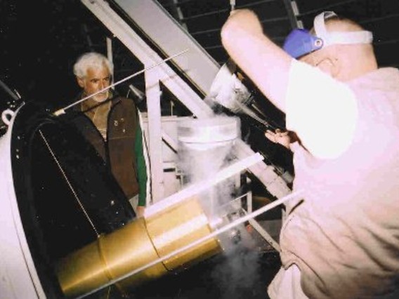 2002 October 21 - A. F. Tubbiolo fills the mosaic cryostat with liquid nitrogen at the prime focus of the SPACEWATCH® 0.9-meter telescope while J. L. Montani looks on. (Photograph by Robert McMillan)