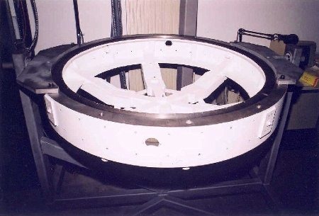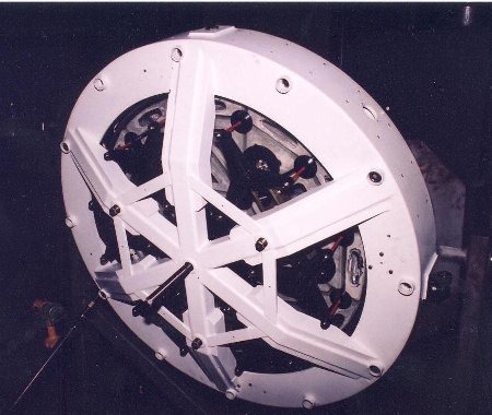 The new primary mirror cell, powder coated white. This cell has excellent ventilation, and will keep the new lightweighted telescope mirror very close to nighttime ambient air temperature. It is provided with an 18-point support system, and a novel radial support system designed by Mike Williams, LPL Senior Staff Engineer.(Photograph by Robert McMillan)