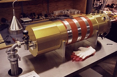 Andrew Tubbiolo and Joe Montani prepare to fill the cryostat through the funnel placed in the end of the unit. (Photograph by Robert McMillan)