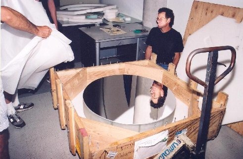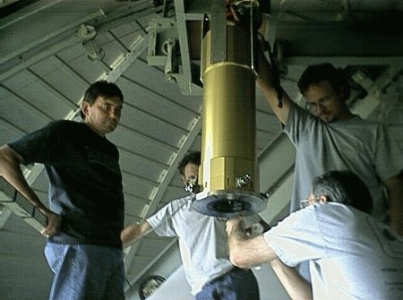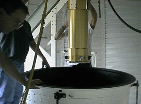 2002 October 14: Cryostat containing the mosaic of CCDs, rigged for hoisting onto the top end of the telescope. Brett Lawrie on the left, Mike Williams behind the cryostat, Bill Verts in the background on the right, and Marcus Perry making adjustments. (Photograph by Terry Bressi)