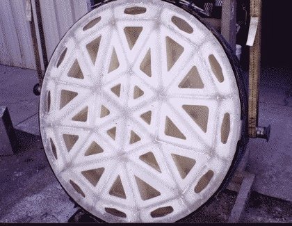 A view from the bottom of the mirror: the open triangular cells are visible (and oblong cells near the perimeter of the mirror). Through the inspection-polished bottom surface one may see the thickness of the Pyrex glass ribs between the open cells. (Photograph by Robert McMillan)