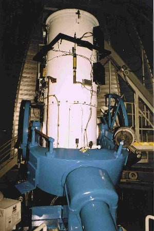 The new cryostat for the CCD mosaic before it was installed on the 0.9-meter telescope. (Photograph by Robert S. McMillan)
