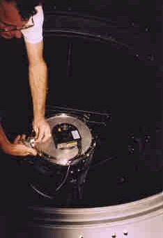 Mike Williams of the LPL Machine Shop installs a small format CCD at the corrected prime focus for initial determination of focus on 2002 Oct. 9. (Photograph by Robert McMillan)