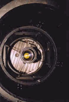 A view from the observing floor of the cast-iron center section of tubework to which attach the top tube section and mirror cell. Note the wood-circle grappling handle which was once used for positioning the telescope in Declination by hand (but not since the move to Kitt Peak in 1962, by which time both axes' motions were electrically motorized). The elevator platform is seen at the top. (Photograph by Robert McMillan)